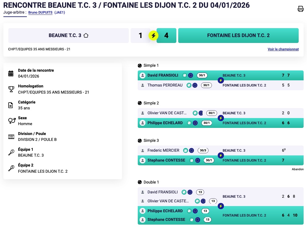 Victoire 4-1 du FDTC 2 contre le Beaune TC 3.
