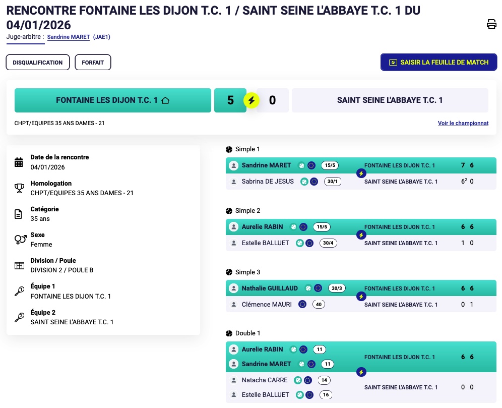 Une seule équipe féminine est engagée cette année, cela permet d’assurer un nombre suffisant de joueuses pour chaque rencontre. Le plus compliqué à gérer au poste de capitaine, c’est la disponibilité des terrains, à Fontaine ou chez nos adversaires, car seuls les courts couverts sont utilisables en cette saison. Alors que nous avons dû nous adapter pour 3 des 4 rencontres suivantes, cette première journée a pu se jouer normalement à Fontaine.