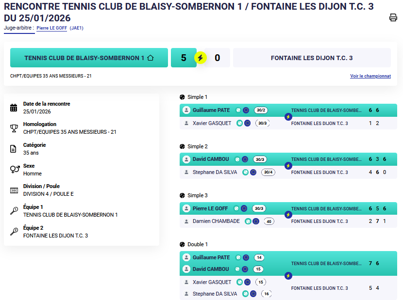 Match contre Blaisy-Sombernon ce dimanche, avec l’occasion de rester en tête de la poule et d’écarter un concurrent pour la montée. Mais les adversaires du jour ne l’entendent pas de cette oreille, et ont aligné une équipe solide et homogène (un 30/2 et deux bons 30/3) face à Xavier, Stéphane et Damien (30/3, 30/4 et 40). Défaite sans appel 5/0, avec néanmoins 2 simples accrochés en 3 sets. Surtout, le double plus disputé aurait même pu tourner en notre faveur et s’est joué sur quelques détails !