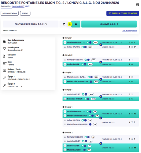 Le match nul était encore envisageable, mais nos deux paires de double fontenoises s’inclinent au super jeu décisif après une belle bataille.