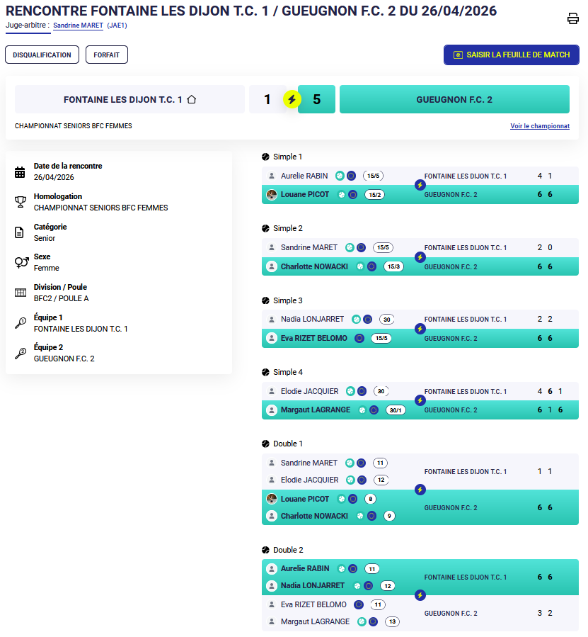 La paire Nadia-Aurélie remmène l’unique point de la rencontre, défaite 5-1 .